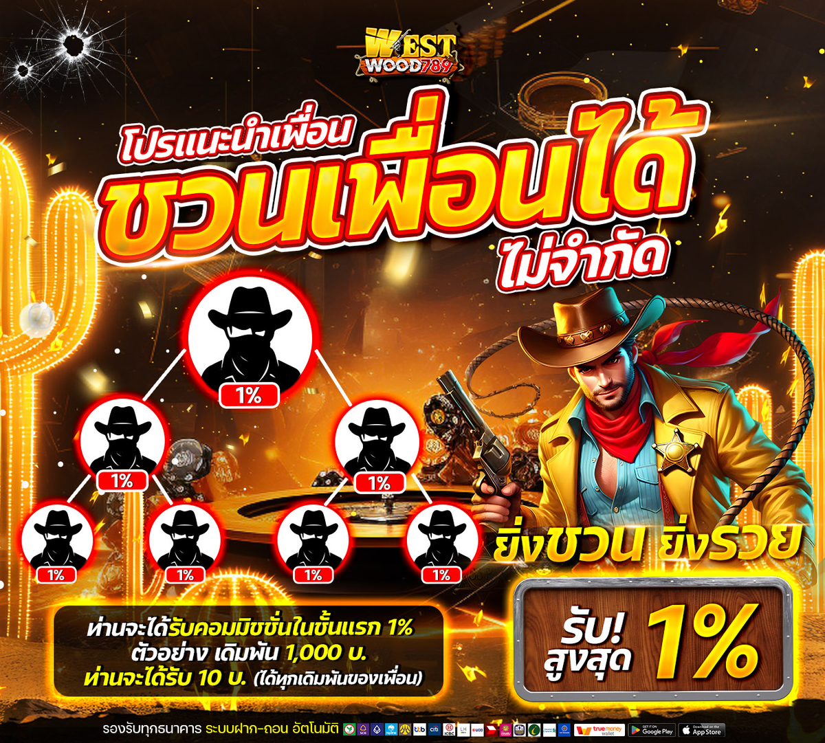 ชวนเพื่อนมาเล่นกับ WESTWOOD789 ไม่ว่าเพื่อนจะได้หรือเสีย รับส่วนแบ่งทันที 1%